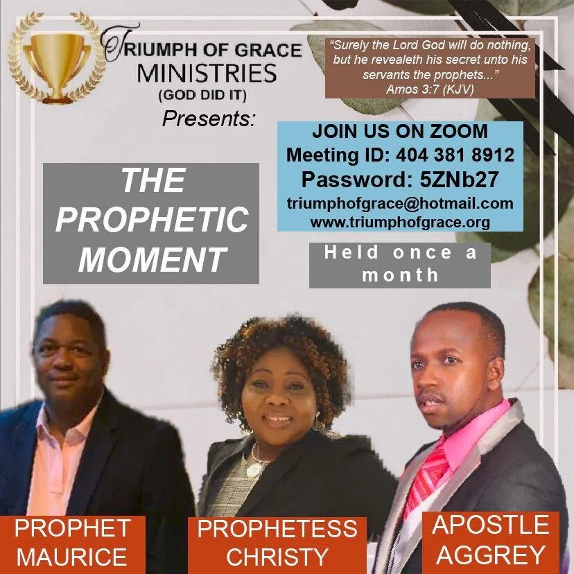 Triumph of Grace Ministries 1/2/21 Triumph of Grace Ministries 1/2/21 Prophetic Moment 2020 Read More Triumph of Grace Ministries 1/1/21 Triumph of Grace Ministries 1/1/21 2020 Thanksgiving Service Read More Triumph of Grace Ministries 1/1/21 Triumph of Grace Ministries 1/1/21 End of Year Crossover Service: Night of Praise Read More Triumph of Grace Ministries 8/28/20 Triumph of Grace Ministries 8/28/20 PRAYER & FASTING Read More Triumph of Grace Ministries 8/28/20 Triumph of Grace Ministries 8/28/20 WOMEN OF HONOUR Read More Triumph of Grace Ministries 8/28/20 Triumph of Grace Ministries 8/28/20 GATHERING OF THE OVERCOMERS Read More