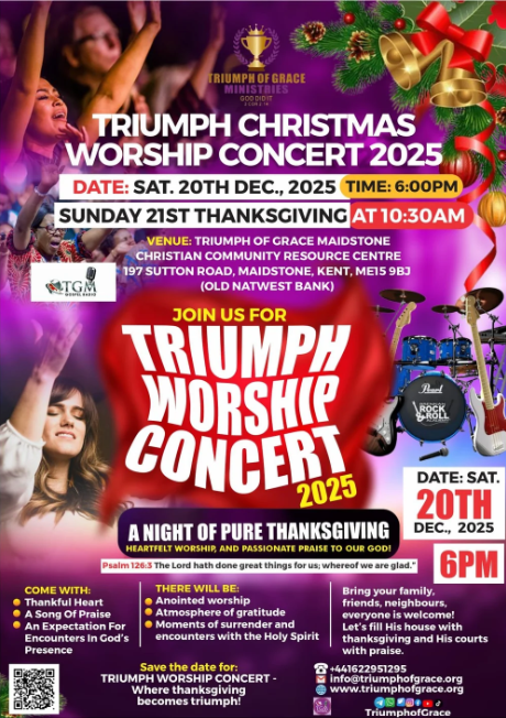 WORSHIP WITH US ON SUNDAY! TO EXPERIENCE THE ATMOSPHERE OF AND FOR WORSHIP AT TRIUMPH OF GRACE MINISTRIES MAIDSTONE. TIME: 10AM !!! WE WE LOVE YOU ❤️