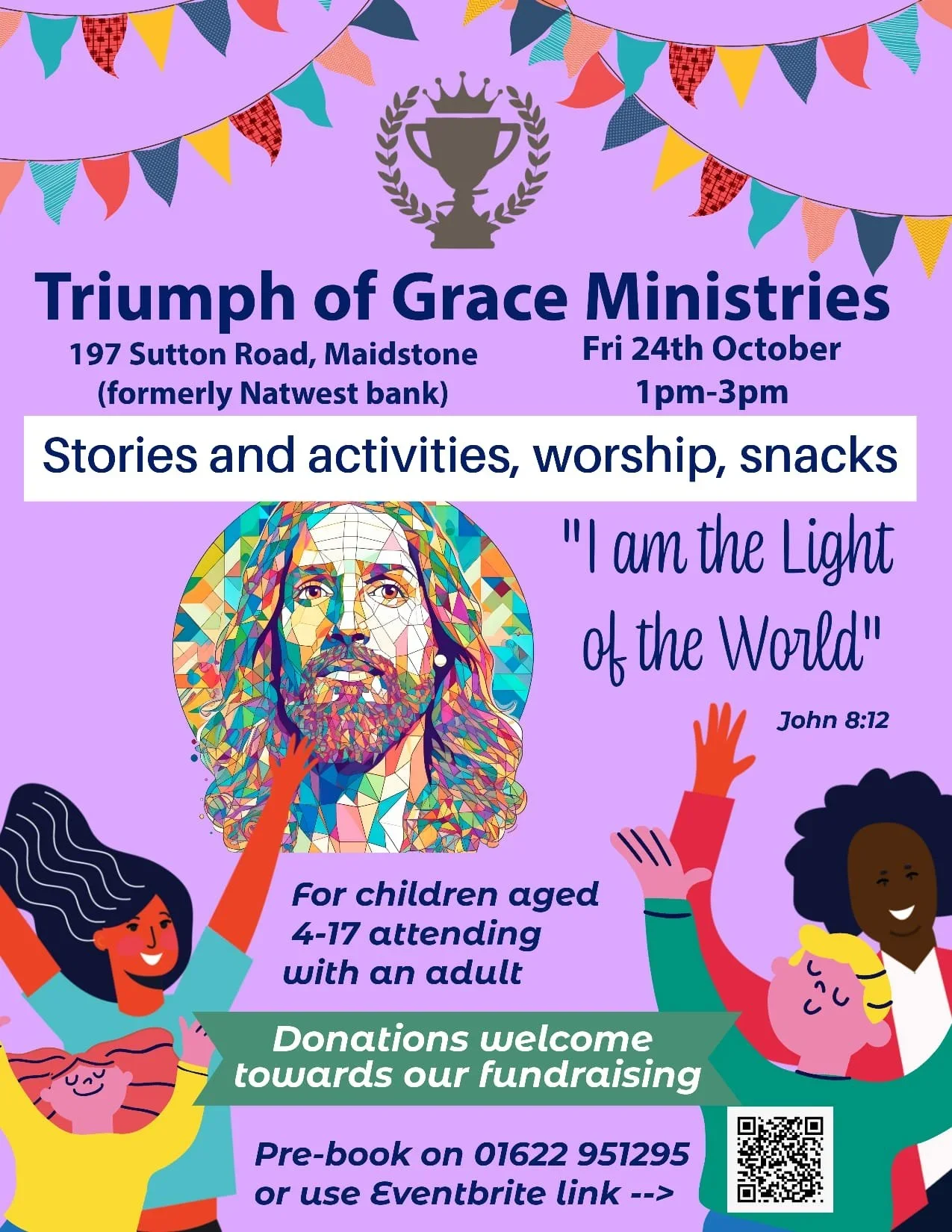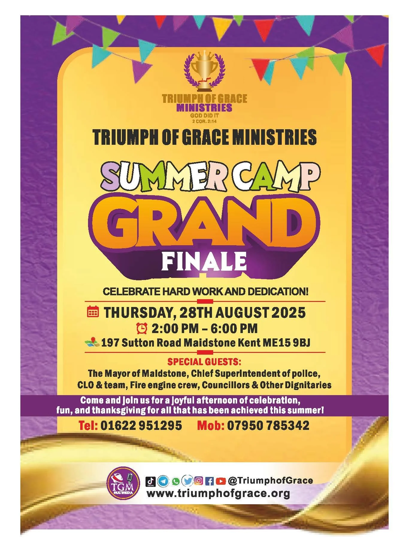 Previous Events at Triumph Of Grace Ministries TGM Grace Arena 1 Year Anniversary 2025 Ending Domestic Abuse Program 2025 Triumph Summer Camp 2025 Women of Honour / Mother’s Day 2025 Maidstone Youthful Opening April 2025 EASTER 2025 Mother’s Day Service 2025 Light Over Maidstone 2024 Christmas Day 2024 New Years Eve 2024 October 2024 Opening Day September 2024 Mess To Message Children’s Activity Workshop Stop Mental Health Program Triumph Summer Camp Grand Finale Triumph Christmas Worship Concert 2025 7 Days Prayer & Fasting TGM Christmas Fair 2025