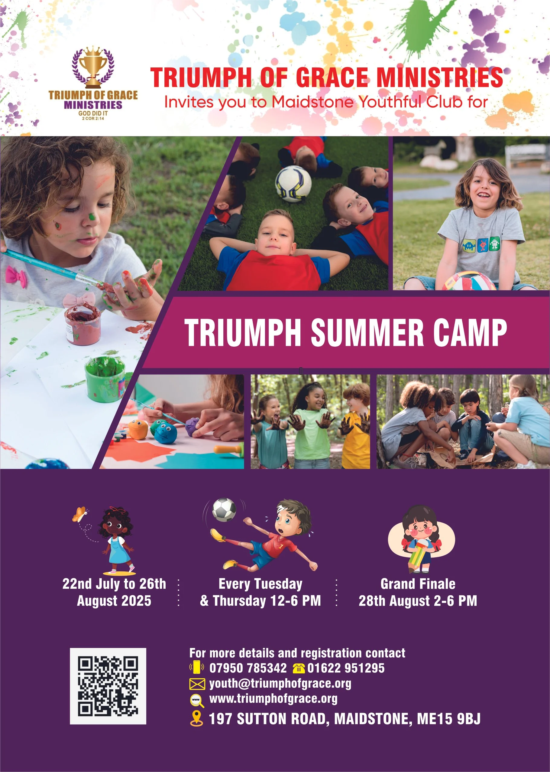Presented to you by Triumph of Grace Christian Community Centre, we will have a 5-a-side youth football tournament held in Shepway, Maidstone, every Tuesday from 22nd July till 26th August 2025! And every Thursday from 26th July to 21st August, youth will be able to do arts and crafts, movies, board games, pool/snooker, table tennis, and sensory space at Triumph of Grace Christian Community Centre, 197 Sutton Road, Maidstone, Kent, ME15 9BJ!